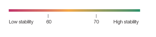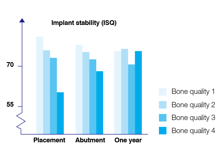 High initial stability (ISQ values 70 and above) tends not to increase with time even if the high mechanical stability will decrease and to be replaced by a developed biological stability. Lower initial stability will normally increase with time due to the lower mechanical stability being enforced by the bone remodeling process (osseointegration). Values such as ISQ 55 or lower should be taken as a warning sign and actions to improve the stability might be considered (larger plant diameter, prolonged healing time etc.)